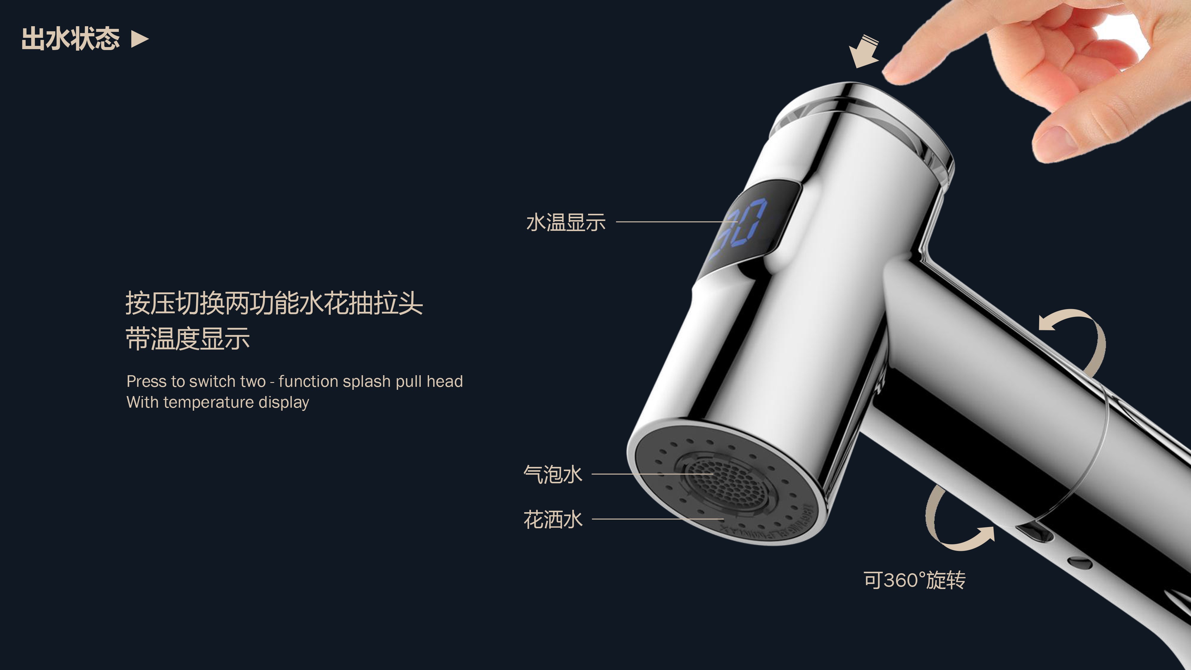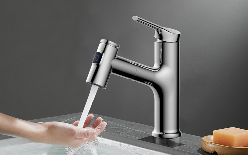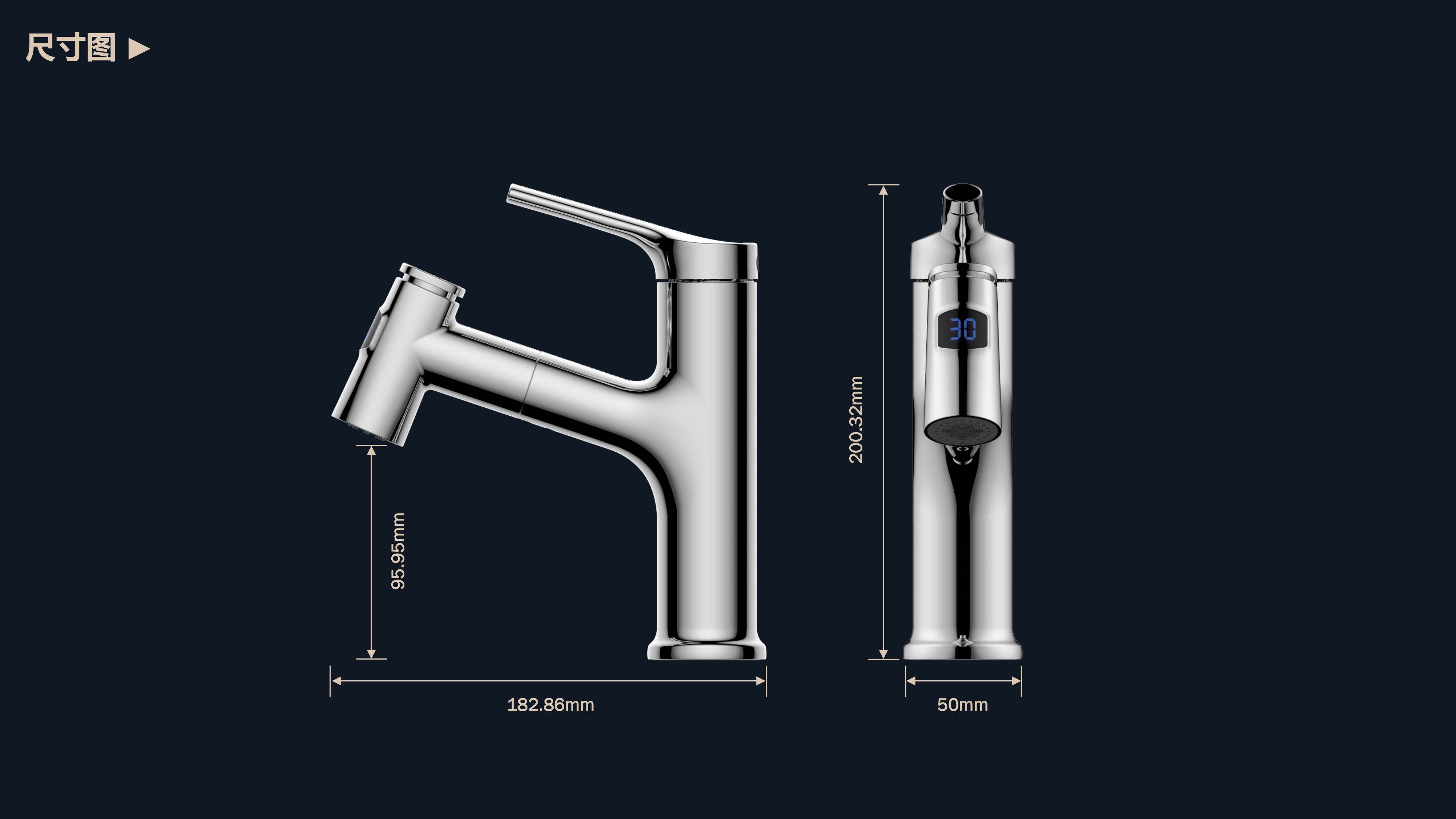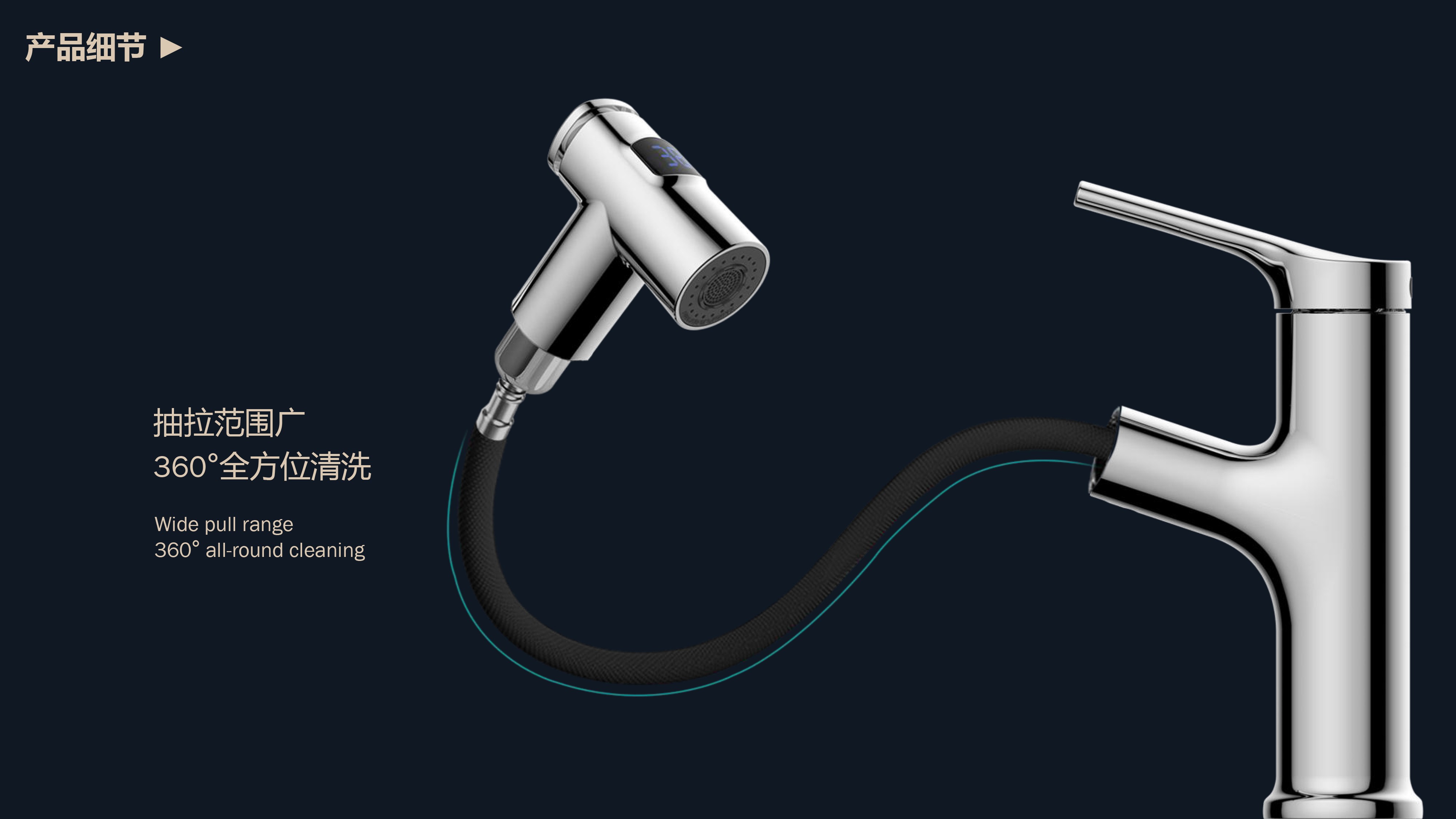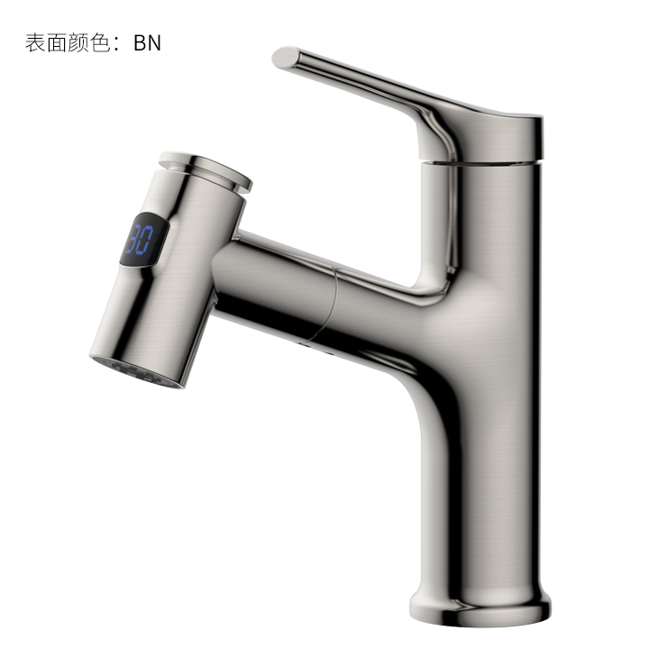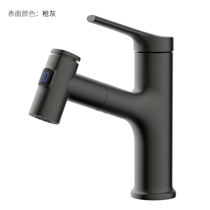 數(shù)顯面盆抽拉龍頭,解鎖龍頭舒適用法;360°全方位清洗;日常洗頭利器,抽拉出水輕松洗;按壓切換兩功能水花抽拉頭;出水溫度實(shí)時(shí)看得見,安全防燙