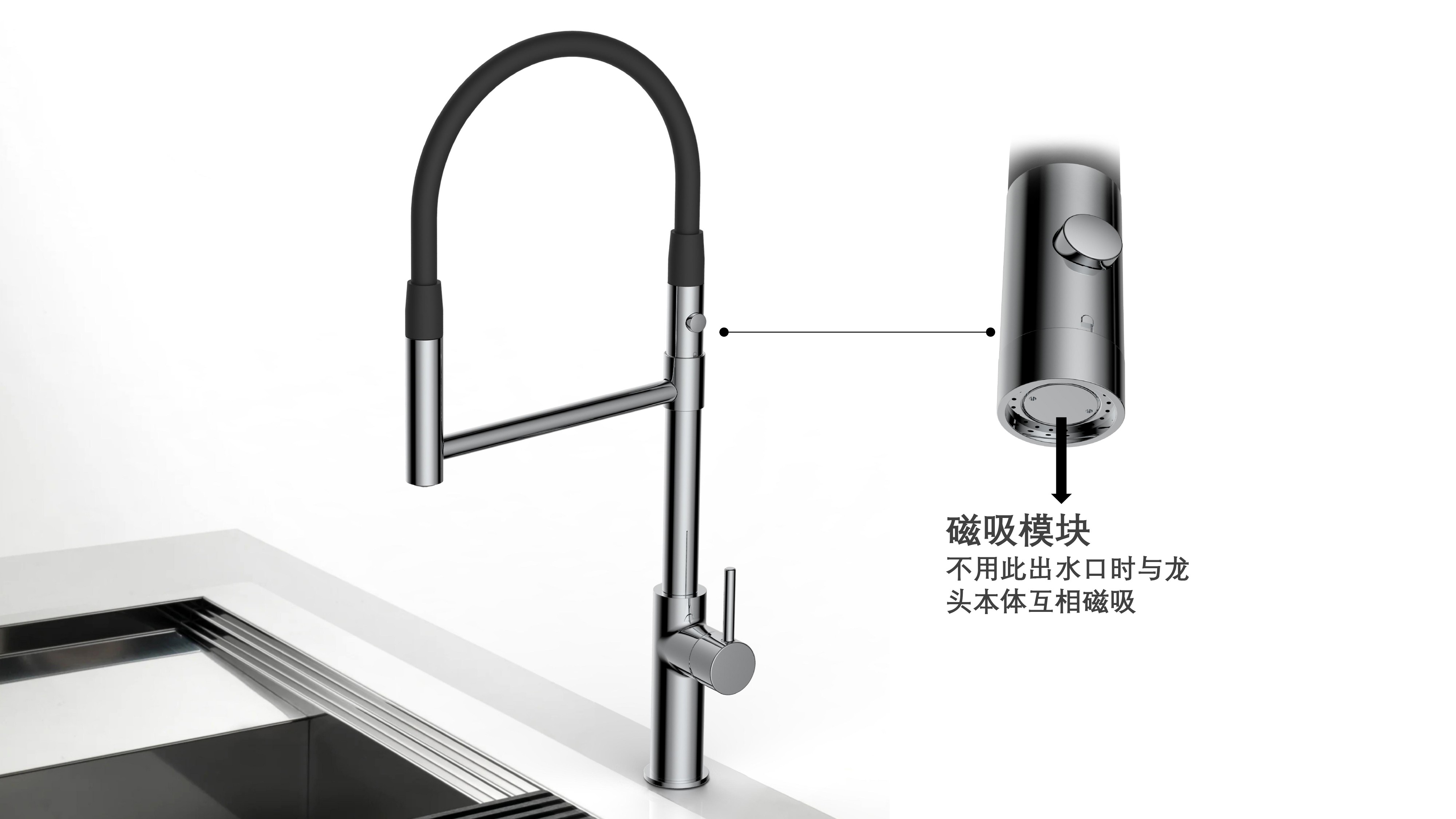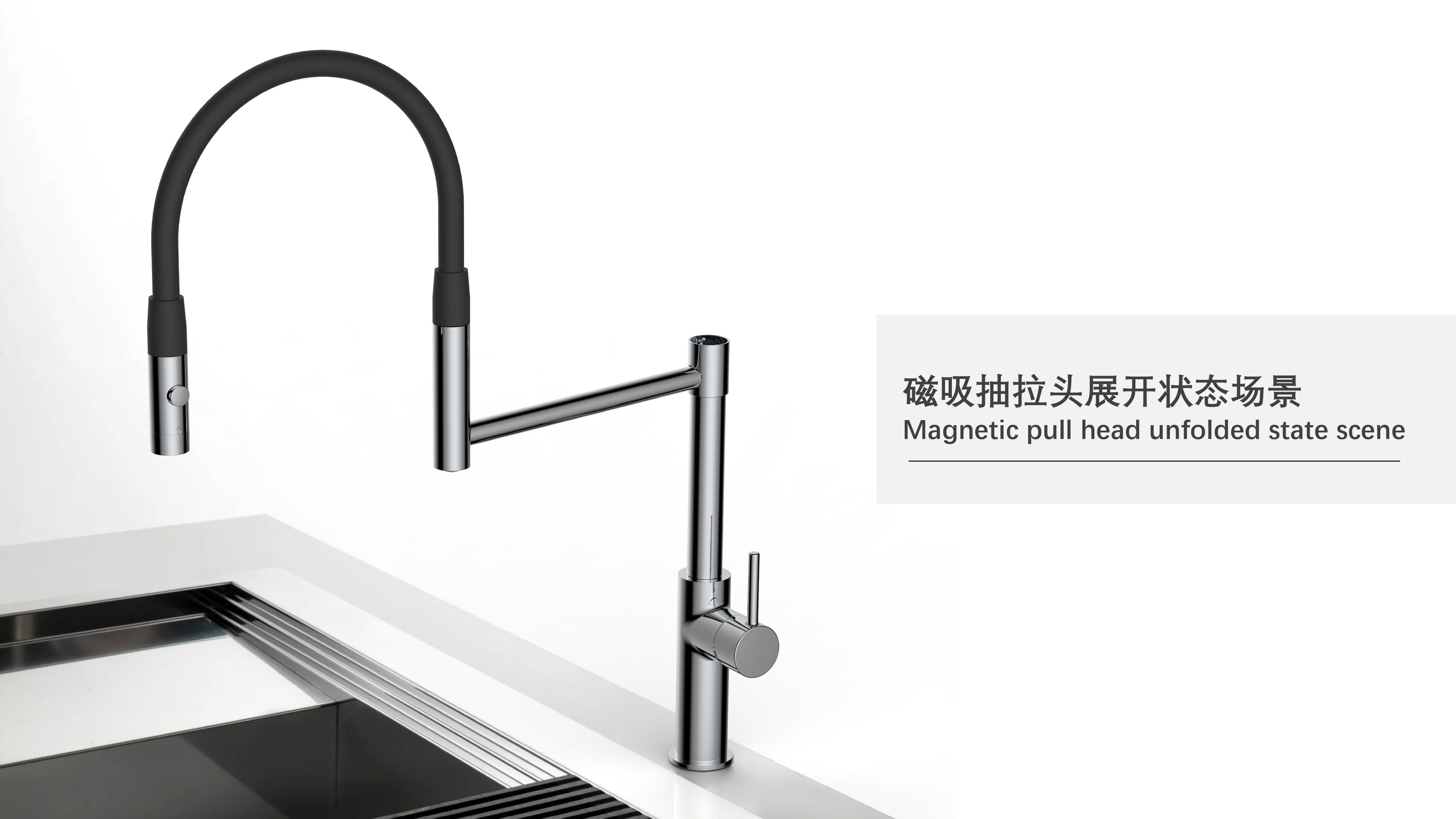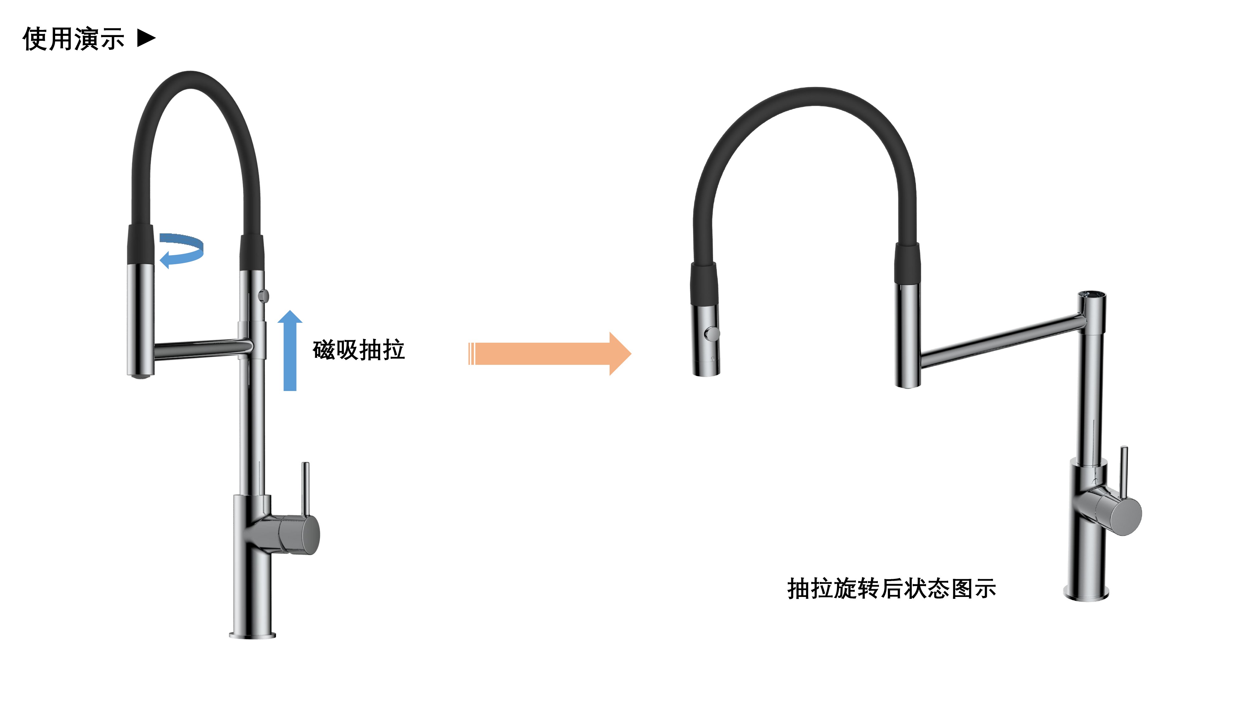 cUPC/ NSF61/ AB100/ NSF372/ Lead Free/ ADA認證;磁吸抽拉廚房龍頭;磁吸抽拉頭可旋轉(zhuǎn)展開使用,不用時旋轉(zhuǎn)回原位磁吸固定;兩種出水可根據(jù)需求切換