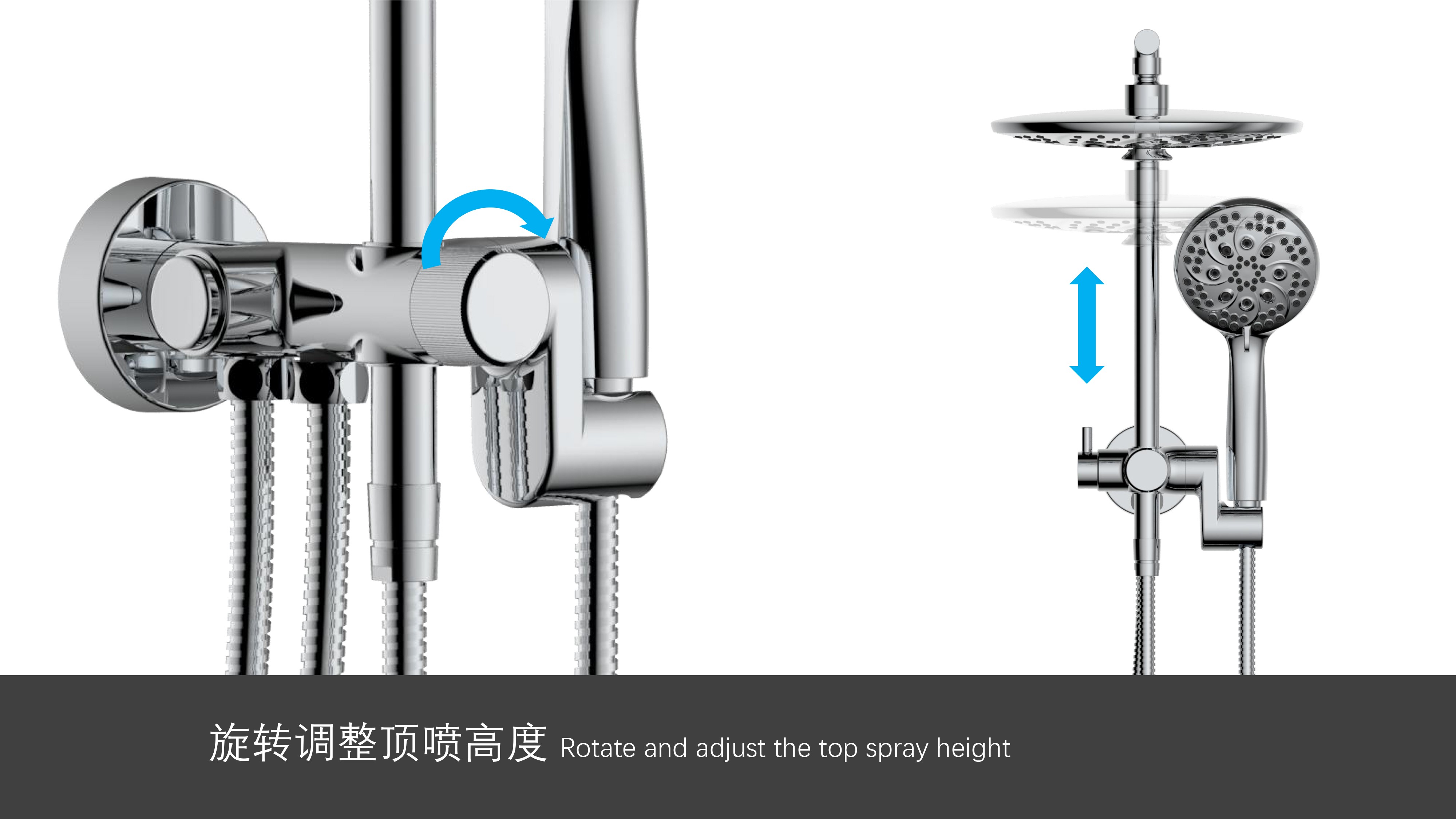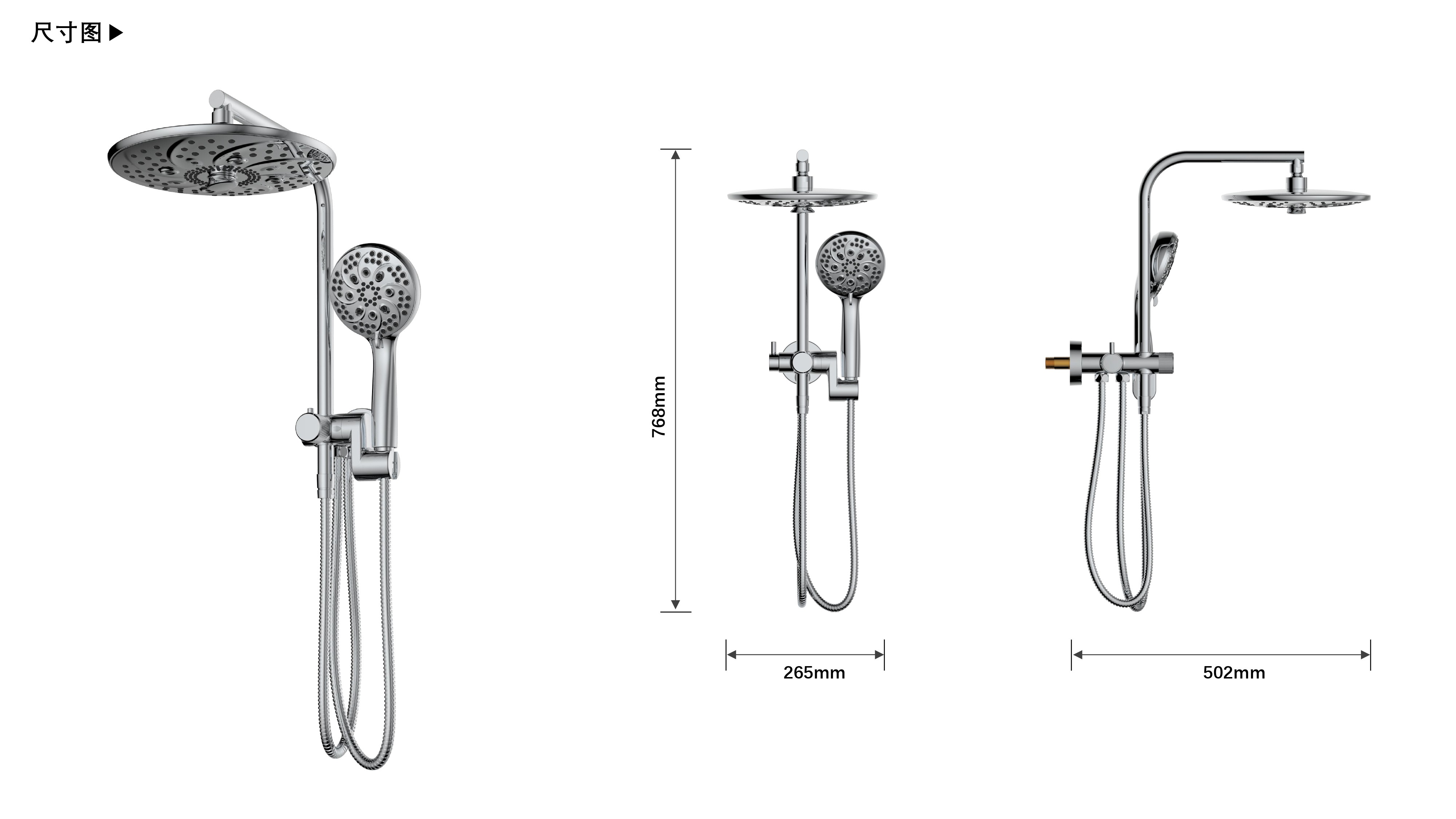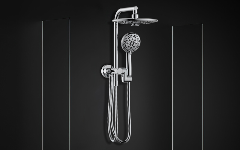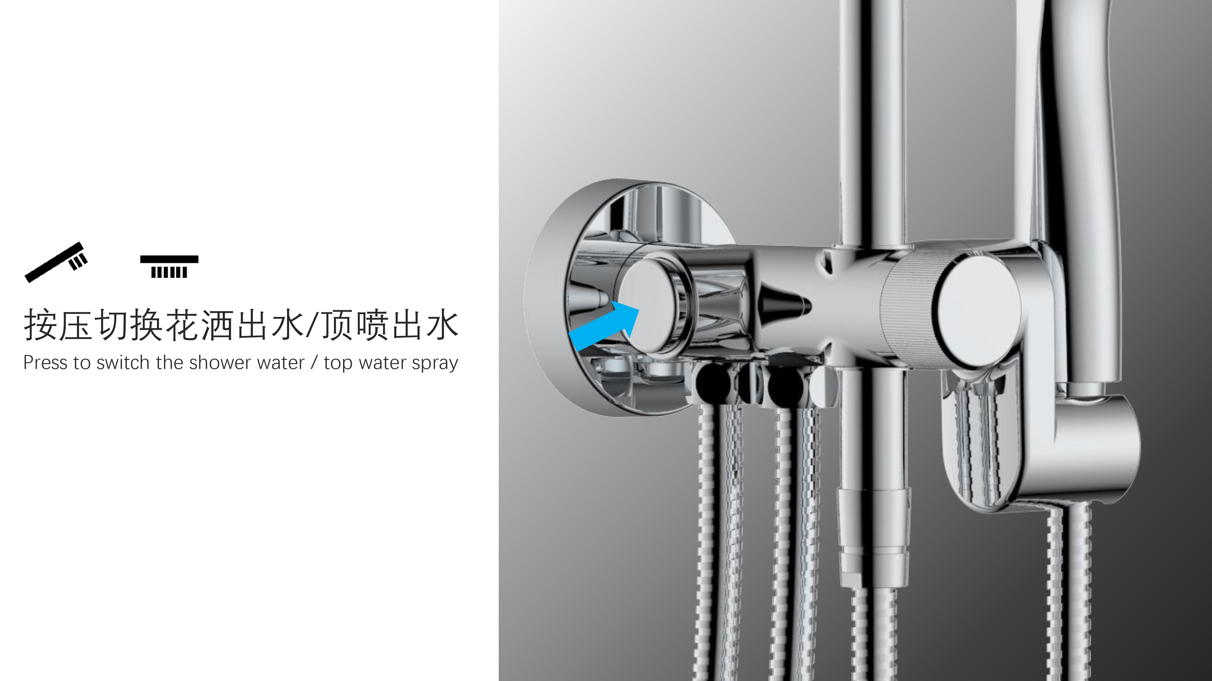 八功能寬大頂噴;Z字形三通;按壓切換頂噴/花灑出水
